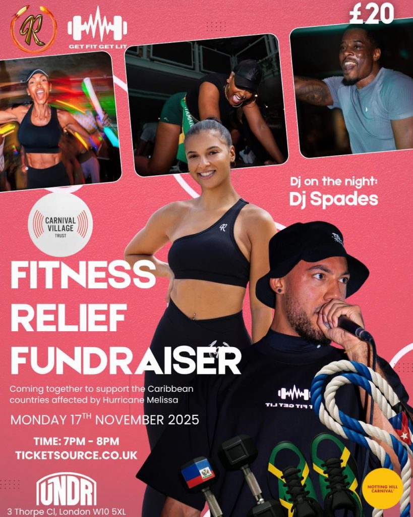 Carnival Village Trust presents… in collaboration with RockItWithRho & GetFitGetLitFITNESS RELIEF FUNDRAISERGet Fit. Get Lit. Give Back. Monday 17th November 2025 – 7PM – 8PMVENUE: UNDR, 3 Thorpe Close, London W10 5XLTICKETS: £20 – BOOK NOWJoin us for a high-energy Carnival-style fitness session with purpose raising funds for Caribbean countries affected by Hurricane Melissa.Get ready for…
